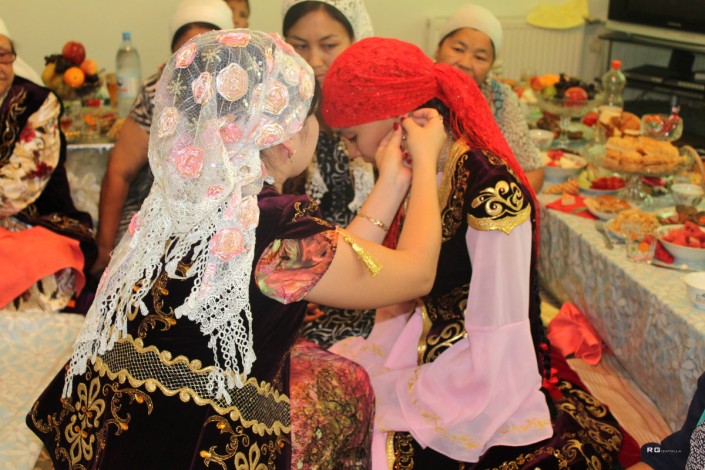 Тут роль, встречающих исполняет сторона невесты. Накрывается стол, нанимается тамада, берется в аренду музыкальная аппаратура и.т.д средняя сумма - 300 тысяч тенге. События происходят в доме невесты. Примерное количество гостей с обеих сторон в среднем может составлять от 30-40 человек. Сторона жениха приобретает золотые серьги для будущей "келін", дополнительно приносят "киіт" (подарки - дубленка, костюмы, золотые украшения и.т.д.), так что сумма доходит до 1 миллиона тенге. А еще есть "қалын мал" - калым-выкуп за невесту, тут цена зависит от социального статуса жениха, сумма может колебаться от 200 тысяч до 500 тысяч тенге. Сторона невесты после такого внимания тоже отвечает взаимностью, и дарят родным жениха ответный "киіт" (золотые украшения, дубленки, костюмы и.т.д.). Итоговая сумма Сырға салу на обе стороны составляет 2,5 миллиона тенге.