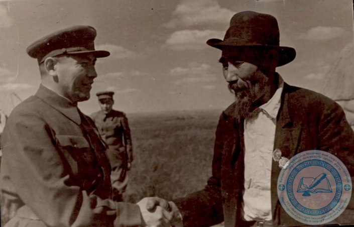 Н. Ундасынов и знатный просовод Ш. Берсиев. 1943 г. Из фондов ЦГА МКС РК.