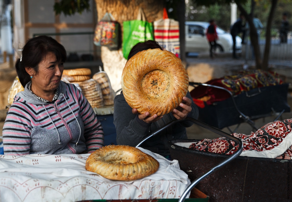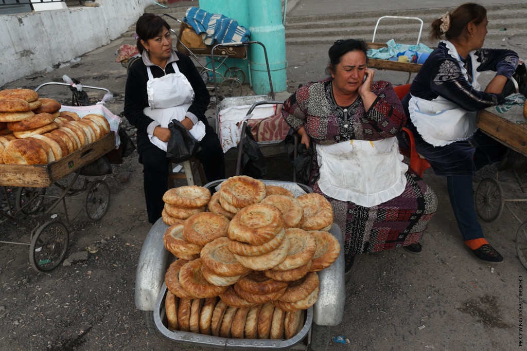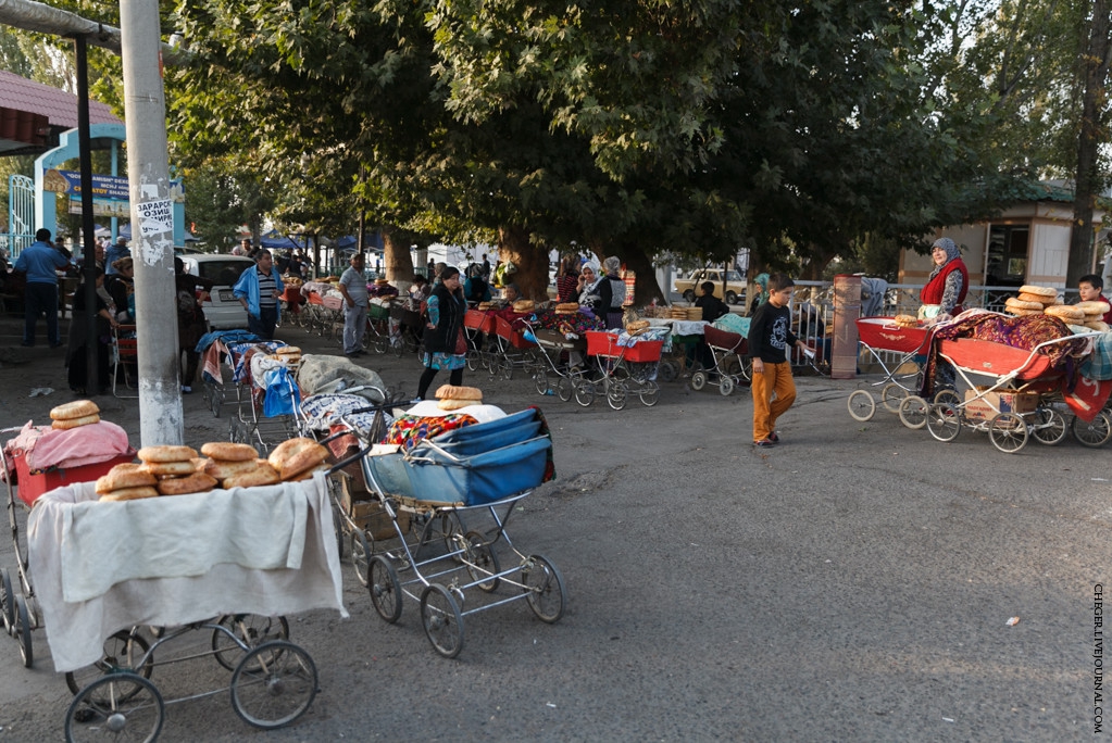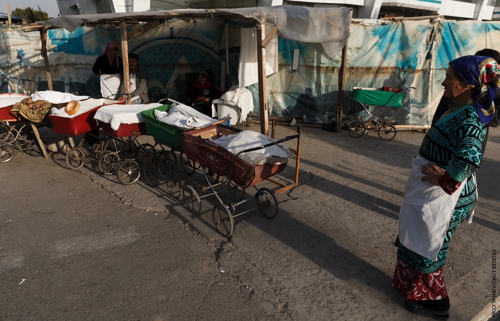 Еще одна характерная черта Узбекистана - практически весь хлеб, а точнее лепешки, продают в детских колясках! Да не в абы каких, а в старых, советских колясках! Такое чувство, что все эти средства передвижения младенцев мигрировали в эту солнечную страну!