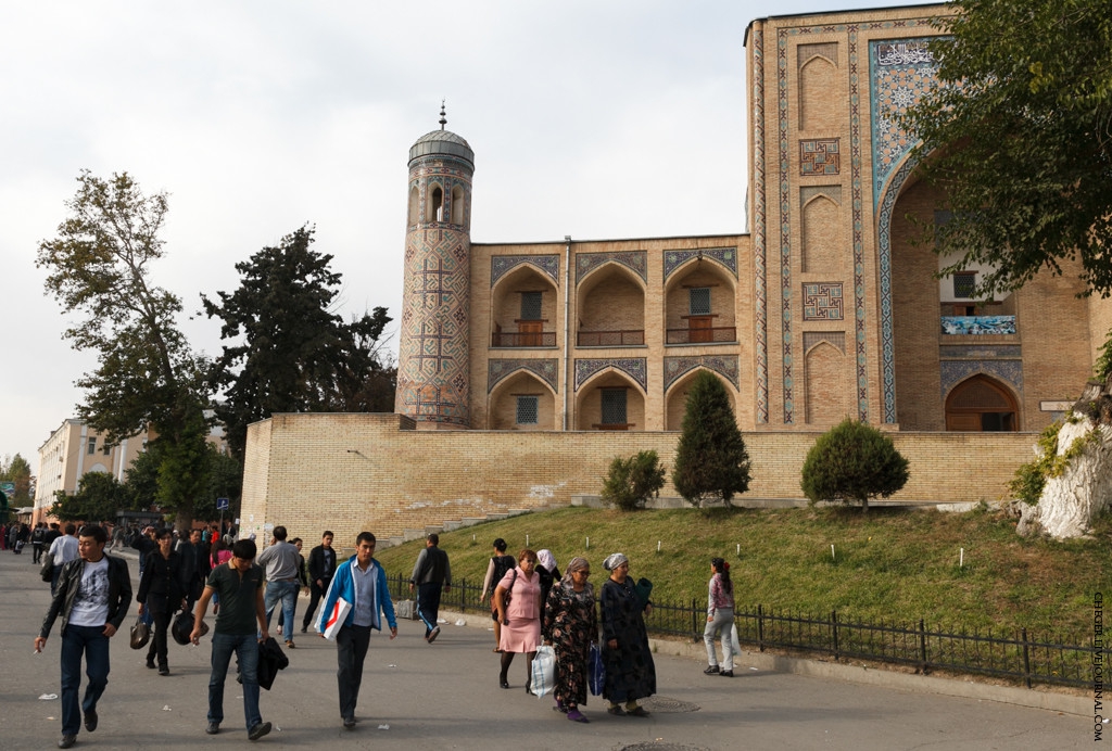 Уже почти по прилету он провожает меня до таможни и подробно рассказывает, как заполнять декларацию и сколько платить таксистам, приглашает к нему домой заехать погостить, но я вежливо отказываюсь, так как в эту поездку Фергана не входит в планы. На таможне в аэропорту Ташкента творится такой ад, что тут точно лучше ко всему отнестись с пониманием и просто спокойно ждать и терпеть людей, которые лезут вперед вас: дипломаты и люди в форме, бабушки и женщины с детьми, а учитывая, что нет ни одного окошка для иностранных граждан, вам приходится просто ждать. На прохождение таможни у меня ушло 2,5 часа. И это в 3 часа ночи. Подробно про все организационные моменты я расскажу в отдельном посте. После прохождения всех формальностей я поймал таксиста и отправился с ним в первый предложенный им отель, коим оказался "Орзу" - довольно неплохой отель почти на проспекте Руставели. Про отели я тоже расскажу в том самом отдельном посте. Немного поспав, я направился смотреть столицу Узбекистана, кстати, третий город по величине бывшего СССР, после Москвы и Киева. Я не планировал особо его смотреть и отвел на него всего один день, но не спать же все время до вечернего поезда в Бухару? На самом деле сейчас это пустой город, такое чувство, что тут остались только школьники, студенты, таксисты и престарелые.