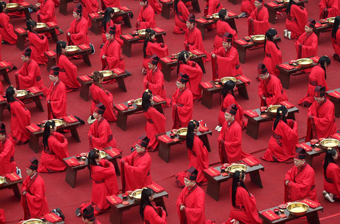 1. 130 пар со всего Китая участвуют в массовой брачной церемонии. Молодожены надели одеяния времен династии Ханьшуй.