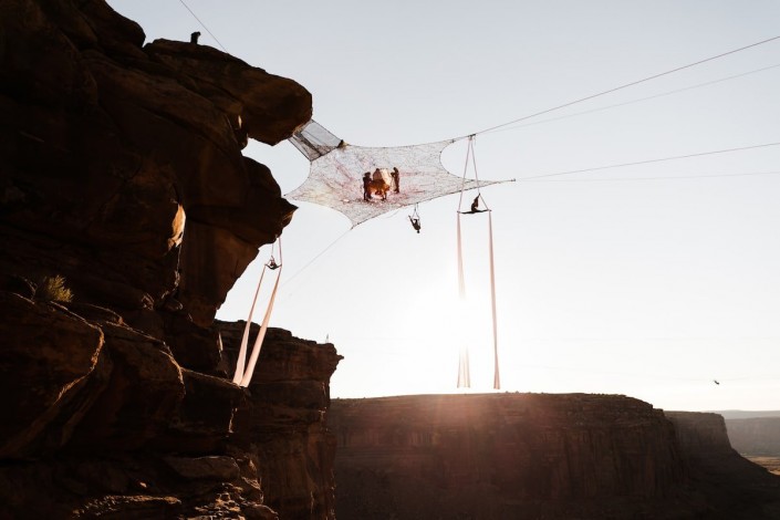 Свадебная церемония влюбленных из США прошла на высоте 122 метра. Молодые связали себя узами брака на растянутой сетке над каньоном Моаб, который находится в южной части Юты и славится своим марсианским пейзажем. Фотографы Эбби и Каллен Хирнс запечатлели экстремальное бракосочетание, сделав потрясающие и захватывающие дух снимки.