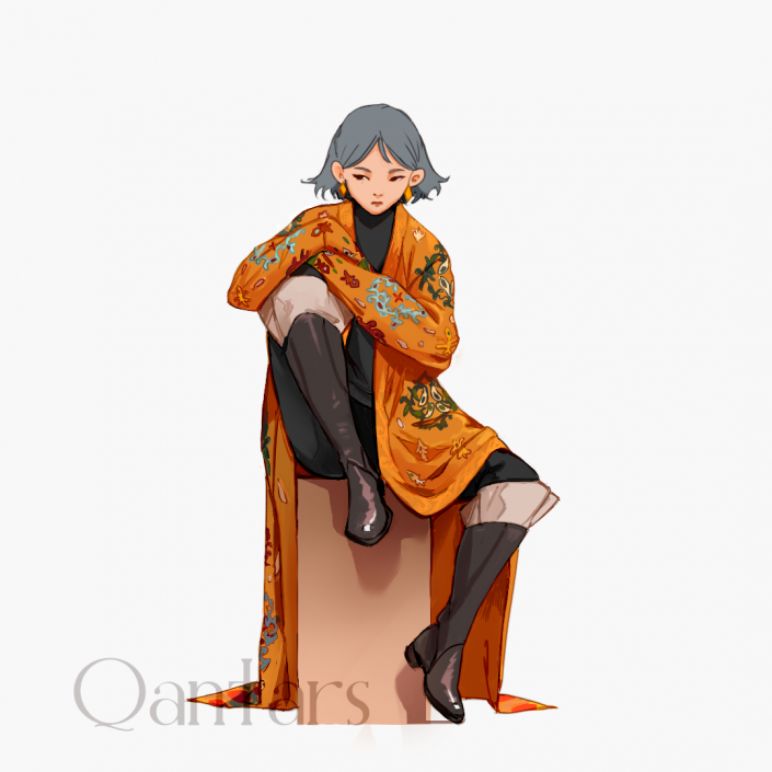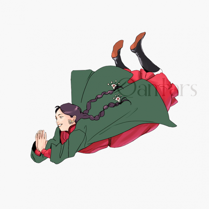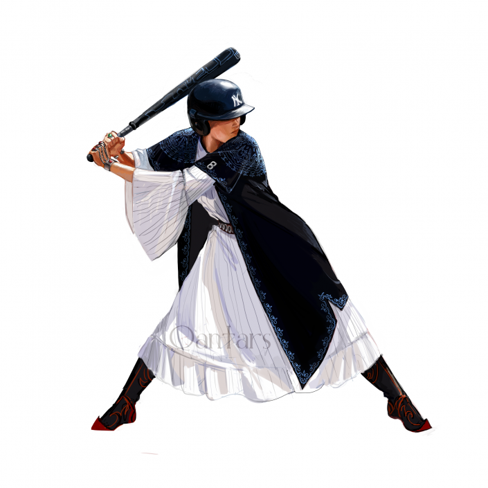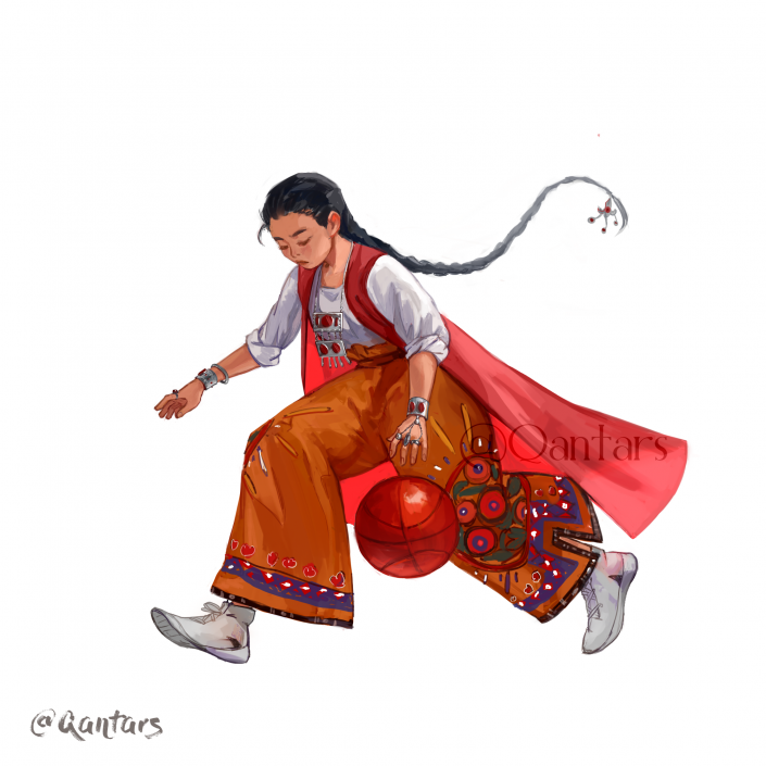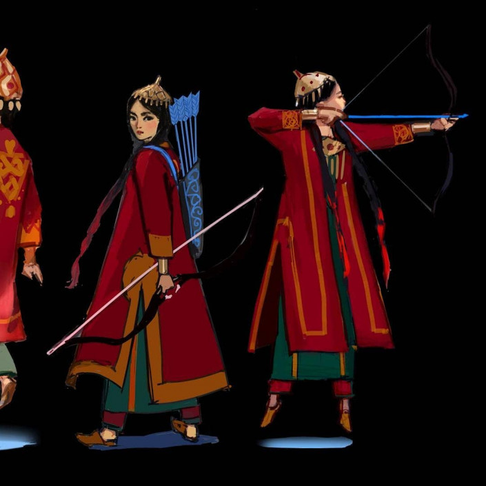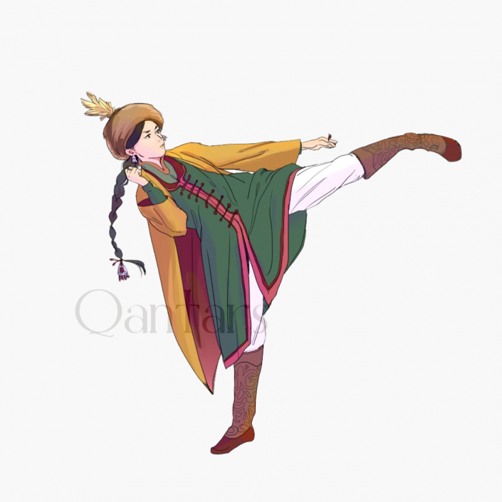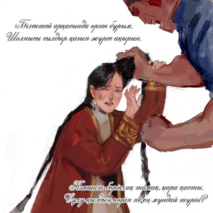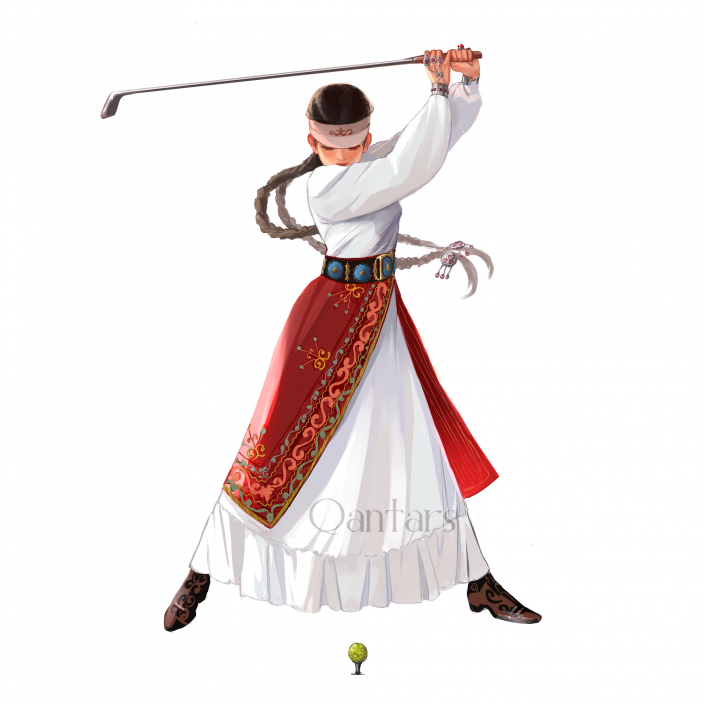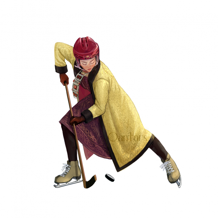 Главный персонаж иллюстратора - стройная девушка лет 20 с длинной косой, любящая спорт. Национальная одежда и украшения прорисованы до мельчайших деталей. К примеру, на этой хоккеистке золотой шелковый чапан, переливающийся орнаментами. На шее серебряный алқа мойын с красным рубином.
