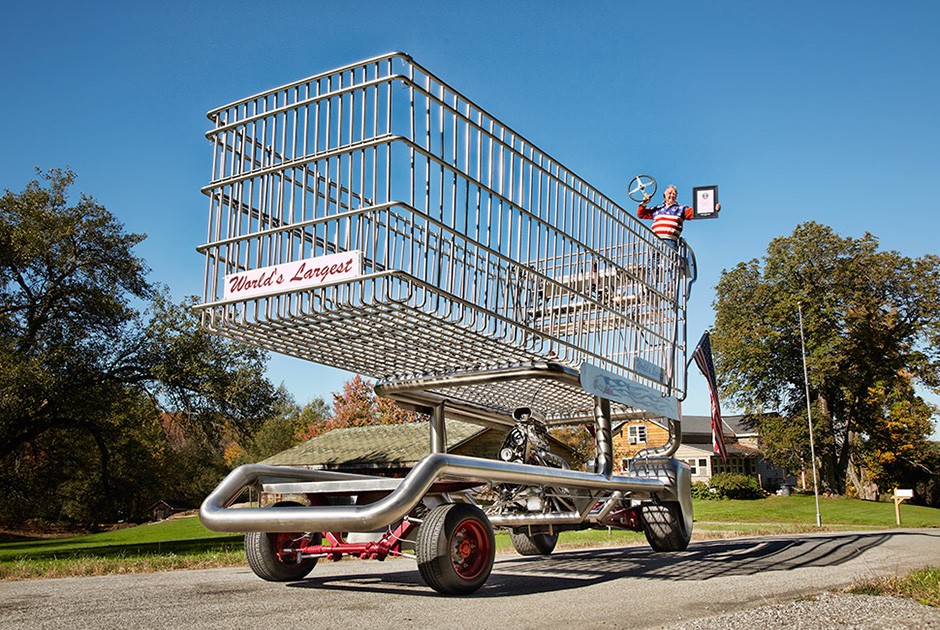 Размеры крупнейшей моторизированной тележки для покупок, которую создал американец Фредерик Рейфстик, составляют 8,23 метра в длину, 4,57 метра в ширину и 2,43 метра в высоту.