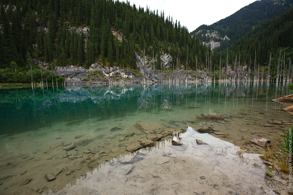 "Горное озеро на высоте 2000 метров, чистейшая вода нереального бирюзового цвета и мертвый лес, стоящий среди нее, - когда-то здесь росли деревья. Вдалеке плавает утка и орет на всю округу, а эхо от ее кряканья разносится в горах... Это утро просто взорвало мой мозг", - пишет Французов после посещения озера Каинды.