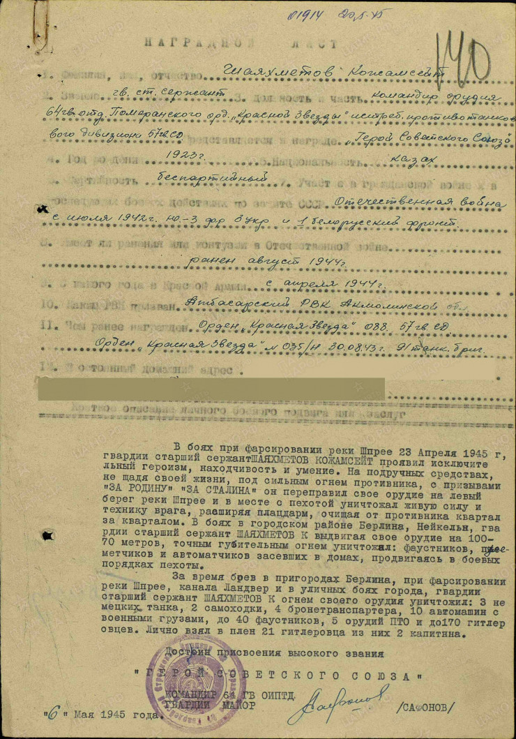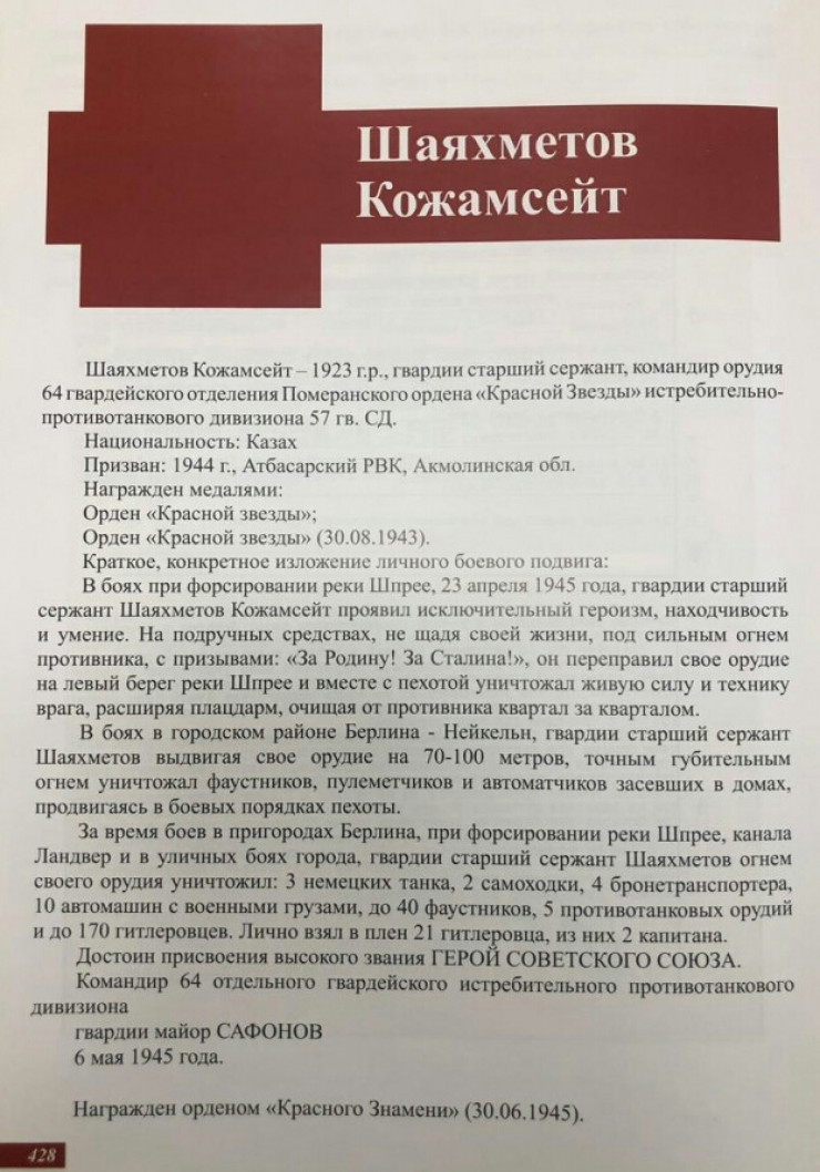 В другом документе, за 6 мая 1945 года, о Шаяхметове имеется следующая информация: "В боях при форсировании реки Шпрее 23 апреля 1945 года гвардии старший сержант Шаяхметов Кожамсейт проявил исключительный героизм, находчивость и умение. На подручных средствах, не щадя своей жизни, под сильным огнем противника, с призывами "За Родину", "За Сталина" он переправил свое орудие на левый берег реки Шпрее и вместе с пехотой уничтожал живую силу и технику врага, расширяя плацдарм, очищая от противника квартал за кварталом. В боях в городском районе Берлина, Нейкельн, гвардии старший сержант Шаяхметов К., выдвигая свое орудие на 100-70 метров, точным губительным огнем уничтожил: фаустник (первый противотанковый гранатомет), пулеметчиков и автоматчиков, засевших в домах, продвигаясь в боевых порядках пехоты.