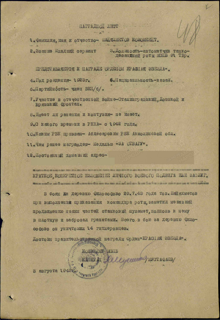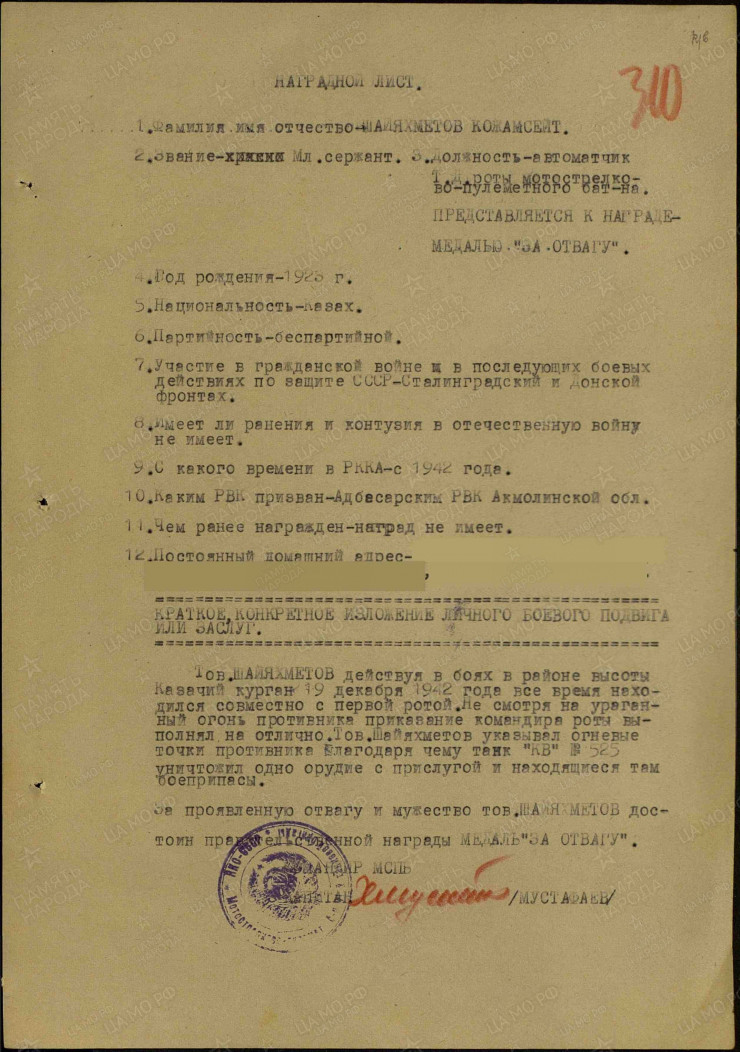 В архивах министерства обороны РФ сохранились документы, подписанные Героем Советского Союза, командиром мотострелкового батальона 91-й отдельной Фастовской танковой бригады 3-й гвардейской танковой армии 1-го Украинского фронта, полковником Хыдыром Гасан оглы Мустафаевым. В них говорится следующее: "Товарищ Шаяхметов, действуя в боях в районе высоты Казачий курган 19 декабря 1942 года, все время находился совместно с первой ротой. Несмотря на ураганный огонь противника, приказ командира роты выполнил на отлично. Товарищ Шаяхметов указывал огневые точки противника, благодаря чему танк "КВ" № 525 уничтожил одно орудие с прислугой и находящиеся там боеприпасы. За проявленную отвагу и мужество товарищ Шаяхметов достоин правительственной награды - медали "За отвагу"".