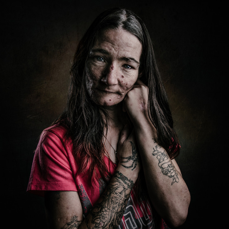 Фото бездомной девушки по имени Кэрол из серии портретов бездомных людей "Дорога, которую я называю домом". В серии портретов фотограф создает простые и непринужденные студийные фото бездомных, подчеркивая их красоту и индивидуальность.