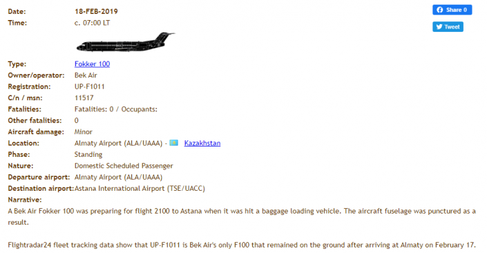 18 февраля этого года был задержан вылет рейса Z92100 Алматы - Астана авиакомпании Bek Air: Fokker 100 получил повреждение фюзеляжа в районе багажной двери во время погрузки багажа и посадки пассажиров на борт. В итоге пассажиры через час вылетели в Астану резервным бортом.