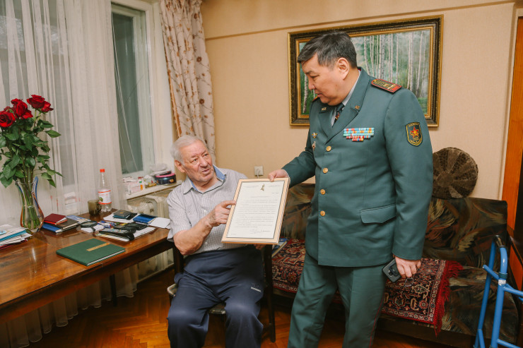 Начальник Департамента по делам обороны Алматы полковник Амантай Усербаев вручает поздравительное письмо Леониду Гиршу от имени министра обороны РК