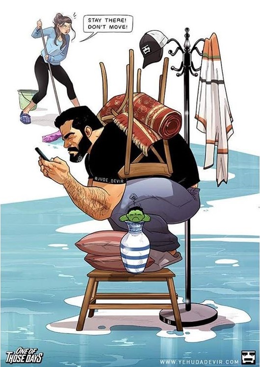 TengriMIX не раз делился с вами иллюстрациями израильского художника Иегуды Девир, в которых главными героями являются он и его супруга. Правдивые моменты из жизни пары вызывают улыбку, ведь забавная бытовуха, несхожесть характеров и мелкие радости знакомы всем семейным людям. Взгляните на свежую порцию работ Иегуды и поднимите себе настроение.