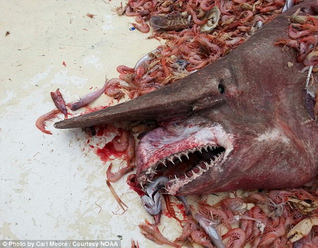 Ее морда заканчивается клювовидным выростом, а длинные челюсти могут далеко выдвигаться. Розового цвета акула потому, что кровеносные сосуды просвечивают сквозь полупрозрачную кожу. Считается самой редкой среди всех акул. Пятиметровый экземпляр недавно был выловлен в Мексиканском заливе.