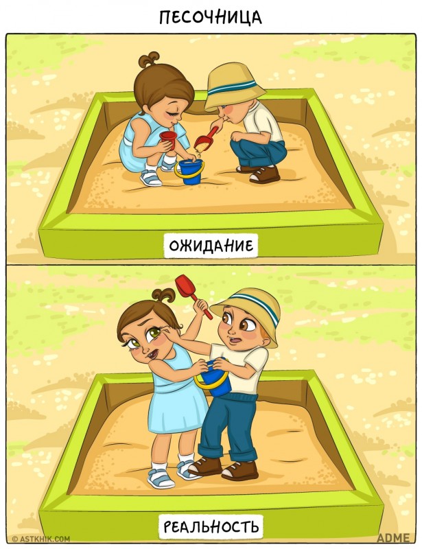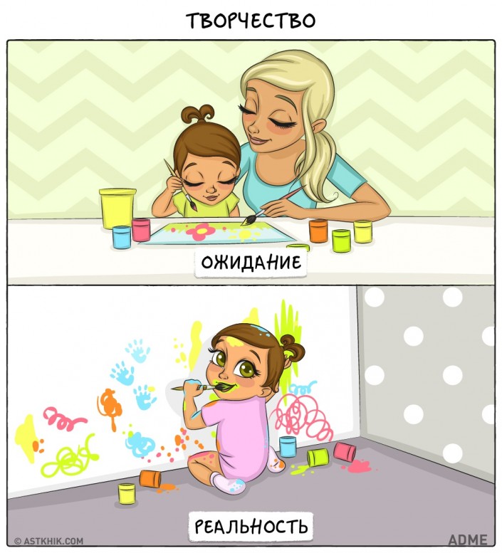 Представления о том, как будет есть или спать ребенок, могут сильно отличаться от реальности. После рождения малыша родители делают много неожиданных открытий о себе, ребенке и новой совместной жизни. Посмотрим на иллюстрации о ярких моментах из жизни семейной пары, у которой появился малыш.