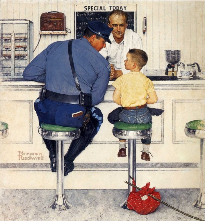 В своих картинах Роквелл изображал идеальную версию мира, наполненную добротой и теплом. Обычно сцены, где дети убегают из дома, должны вызывать беспокойство и тревогу. Но только не здесь - маленький беглец, оказавшийся в баре, окружен заботой и защищен. Сам мальчик словно под охраной в центре треугольника - слева по-отечески к нему склонился полицейский, в центре добродушно улыбается бармен, а справа, судя по пустой кофейной чашке, не так давно сидел еще один добрый человек. В мире художника ни один ребенок не подвергнется опасности, а для полицейского нет более серьезных дел, чем поговорить с юным беглецом и убедить его вернуться домой.