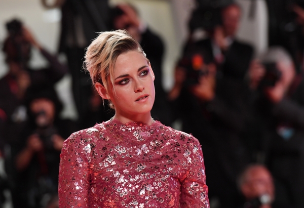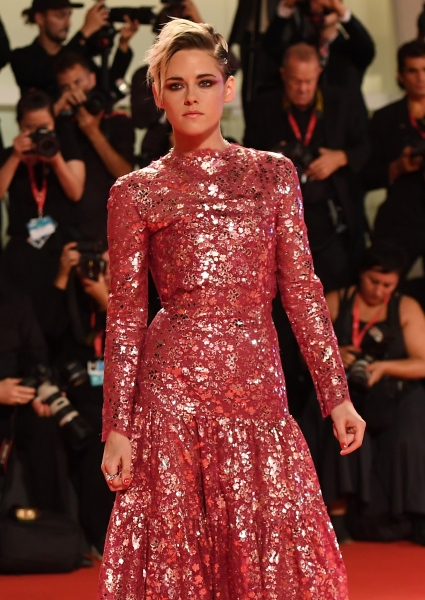 Малиновое платье в пол с выбитыми серебристыми цветочками было на актрисе Кристен Стюарт перед премьерой фильма режиссера Бенедикта Эндрюса "Сиберг".