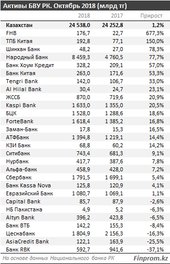 Активы банков Казахстана достигли 24,5 триллиона тенге на конец октября 2018 года, передает Tengrinews.kz со ссылкой на Finprom.kz.
