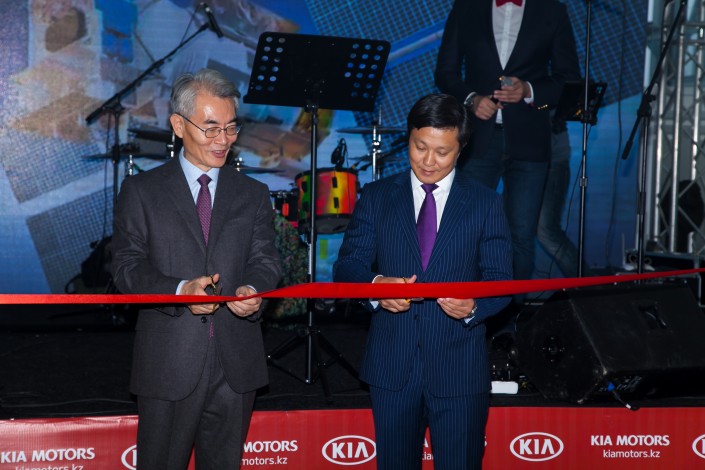 Посол Республики Корея Ким Дэсик и председатель Ассоциации транспортников Астаны Медет Курманов стали первыми почетными гостями столичного автоцентра KIA