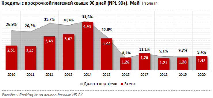 В то же время объем токсичных займов с просрочкой платежей свыше 90 дней (NPL 90+) также вырос: на 1,5 процента за месяц и сразу на 10,9 процента — за год, до 1,42 триллиона тенге, против всего 1,28 триллиона тенге годом ранее. Впрочем, это лишь 9,4 процента от ссудного портфеля БВУ РК против 9,7 процента годом ранее.