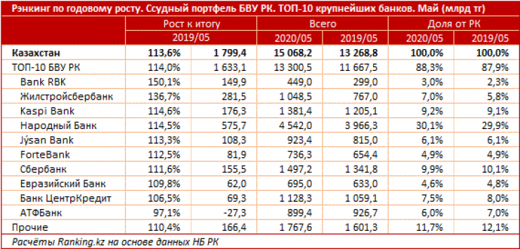 Среди крупнейшей десятки банков-кредиторов страны уверенно лидирует по годовому росту объемов кредитования Bank RBK: кредитный портфель банка увеличился сразу в полтора раза, до 449 миллиардов тенге.