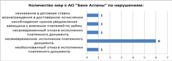В отношении АО "Банк Астаны" количество ограниченных мер воздействия составило также 16 процентов от общего количества мер - за нарушения по несвоевременному исполнению платежных документов и необоснованному отказу в их исполнении.