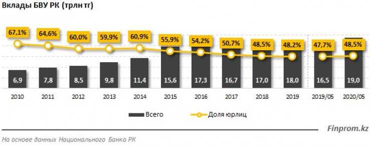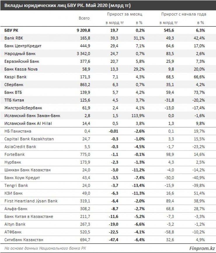 Корпоративные вклады по итогам мая текущего года составили 9,2 триллиона тенге — на 19,7 миллиарда тенге (0,2 процента) больше, чем в апреле 2020-го. Из 27 БВУ РК прирост за месяц показали всего 12 банков.