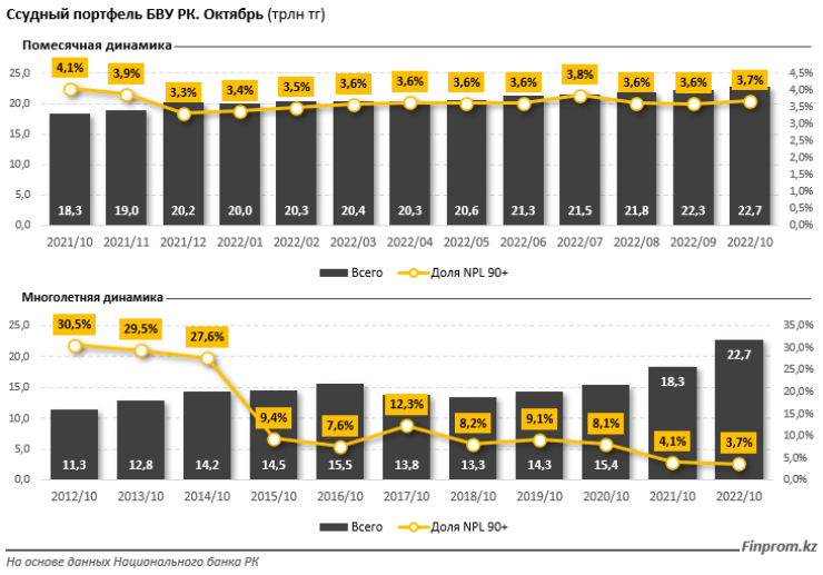 Объемы кредитования в Казахстане растут - сразу 8 банков из топовой десятки увеличили ссудный портфель, сообщает finprom.kz. Только за октябрь динамика роста достигла показателя в 1,8 процента и общий ссудный портфель банков второго уровня в Казахстане достиг отметки 22,71 триллиона тенге. Стоит отметить, что годовой рост составил 23,9 процента.