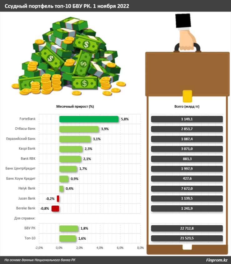 Лидером роста объема займов в месячном эквиваленте стал ForteBank (+5,8 процента). Общий объем кредитного портфеля Forte на 1 ноября составляет 1,15 триллиона тенге. Аналитики FinProm отмечают, что динамика роста банка в целом стабильна, несмотря на все кризисные явления в экономике Казахстана и мировой экономике. Показатели банка демонстрируют рост кредитного портфеля на 35,8 процента в годовом эквиваленте.