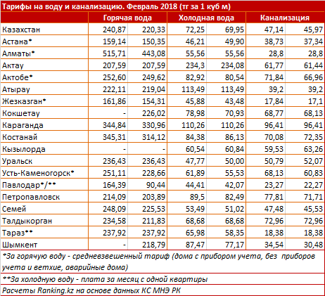 Ранее Комитет по регулированию естественных монополий, защите конкуренции и прав потребителей МНЭ РК сообщал, что в 2018 году в рамках утвержденных на пятилетний период предельных тарифов изменение цен на услуги водоснабжения и водоотведения будет производиться в 12 регионах страны: городах Астана и Алматы, Акмолинской, Актюбинской, Костанайской, Западно-Казахстанской, Восточно-Казахстанской, Жамбылской, Карагандинской (город Жезказган), Павлодарской, Северо-Казахстанской и Южно-Казахстанской областях.