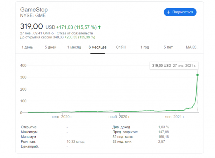 26 января акции GameStop стали самыми торгуемыми в мире, обойдя ценные бумаги Tesla, Apple и Microsoft, а с открытием сессии 27 января цена подскочила еще на 152,74 процента - до 374 долларов за одну ценную бумагу.