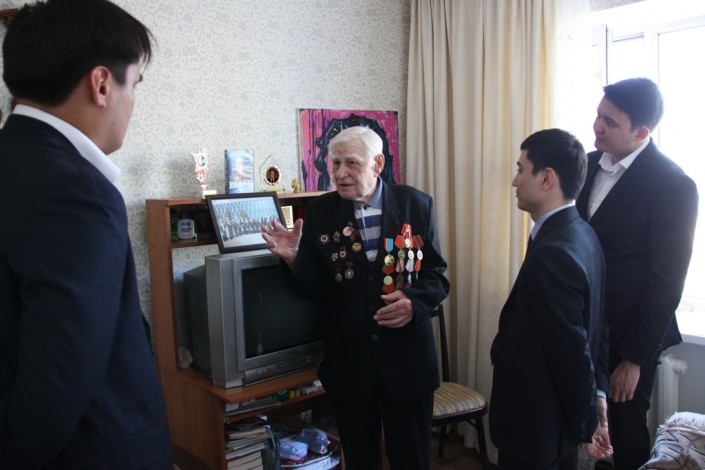 Ахат Бекмади до приезда гостей побывал в школе № 22, где прошла очередная историко-познавательная встреча. Ахат Бекмадияулы готов рассказывать о боевых сражениях, фронтовых друзьях и послевоенном времени часами. Его дважды ранили - осколком в спину, потом в ногу. Ветеран благодарен судьбе за то, что остался жив в той войне. Сейчас ему 94, мечтает справить вековой юбилей. Гостям пожелал перешагнуть его возраст:
