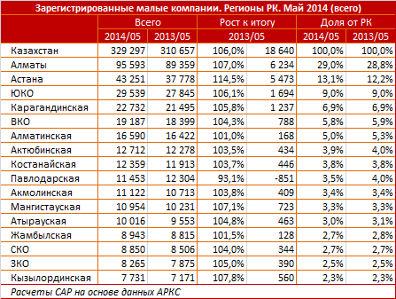 За 2013-2014 годы в Алматы количество активных юрлиц в малом бизнесе сократилось с 23,4 до 18 тысяч. В Южно-Казахстанской - с 9,6 до 7,6 тысячи. В Астане за год количество активных юрлиц в малом бизнесе сократилось с 8,1 до 7,9 тысячи.