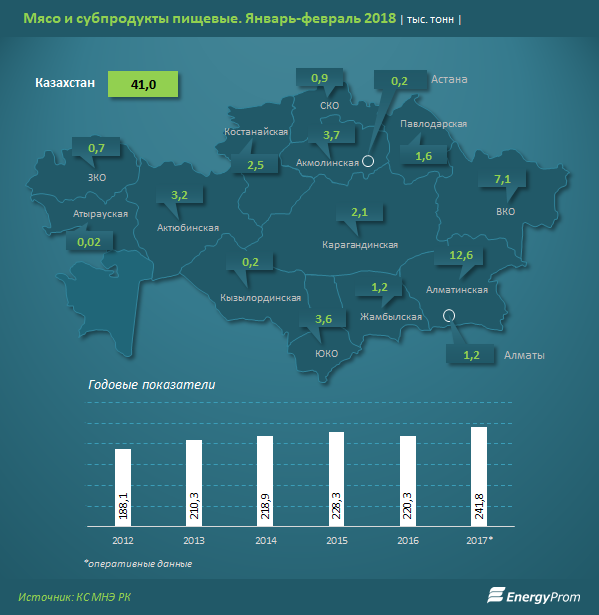 Производство мяса растет - за два месяца объемы выпуска достигли 41 тысячи тонн - сразу на 12,8 процента больше, чем годом ранее. Наибольшие объемы производства сконцентрированы в Алматинской области, ВКО и Акмолинской области.
