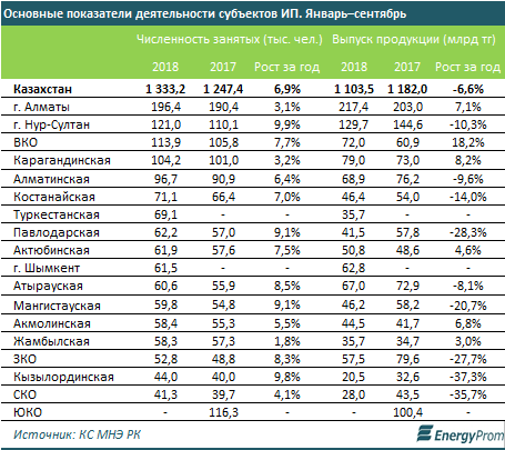 В целом по итогам третьего квартала 2018 года численность занятых в действующих ИП составила 1,3 миллиона человек - на 6,9 процента больше, чем годом ранее. Выпуск продукции за январь-сентябрь 2018-го составил 1,1 триллиона тенге, что на 6,6 процента меньше, чем за аналогичный период предыдущего года.