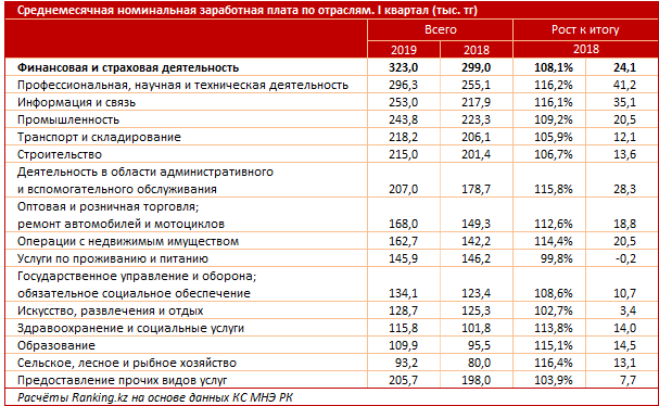 Наибольшая заработная плата - у работников финансовой и страховой сферы: 323 тысячи тенге, годовой прирост составил 8,1 процента. На втором месте сфера профессиональной, научной и технической деятельности: 296,3 тысячи тенге, +16,2 процента год к году. Сотрудники сферы информации и связи в среднем получают 253 тысячи тенге, +16,1 процента год к году, эта сфера замыкает тройку наиболее высокооплачиваемых.