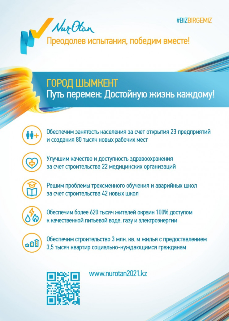 Как отметили в пресс-службе партии Nur Otan, в ближайшие 5 лет в Шымкенте в рамках предвыборной программы планируется обеспечить строительство 42 школ и 22 медицинских учреждений. Более 620 тысяч жителей окраин будут обеспечены чистой питьевой водой, природным газом и электроэнергией. Особый акцент будет сделан на строительстве 3 миллионов квадратных метров жилья с предоставлением 3,5 тысячи квартир социально нуждающимся гражданам.