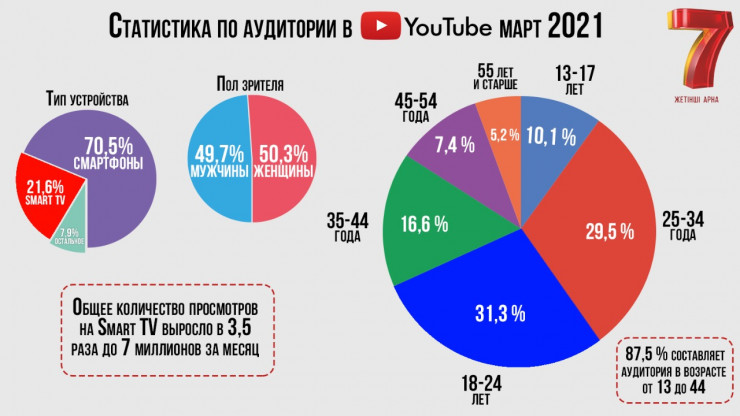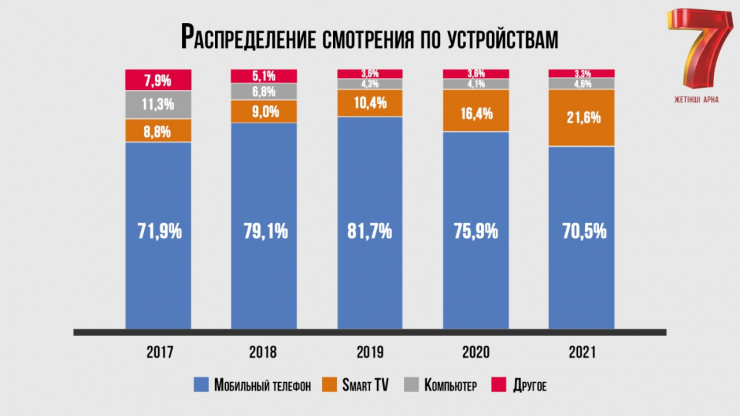 Очень важно для индустрии понимать, на каких устройствах происходит потребление контента и как менялась картина. На данный момент продукты "Седьмого канала" на YouTube 70,5 процента аудитории смотрят на мобильных телефонах, 21,6 процента - на Smart TV, остальное – иные устройства. При этом важно отметить, что с 2017 года доля просмотров на Smart TV выросла в 2,5 раза, а общее количество просмотров на Smart TV выросло в 3,5 раза до 7 миллионов за месяц.