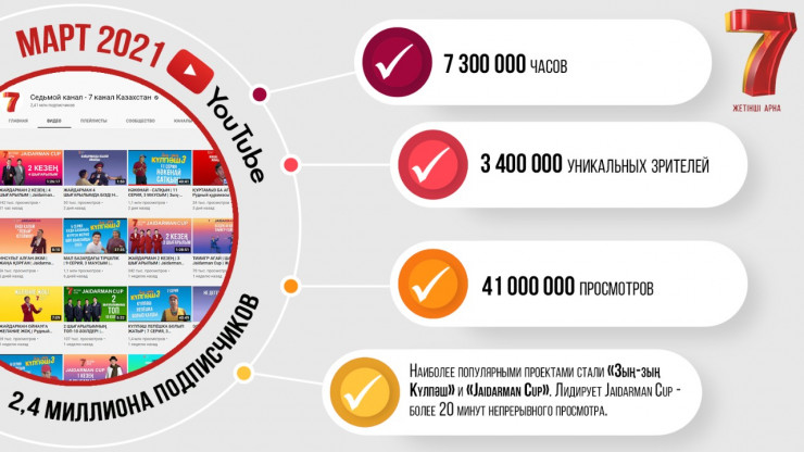 Количество подписчиков "Седьмого канала" на платформе YouTube составило более 2 400 000. Отметим, "Седьмой канал" имеет наибольшее количество подписчиков в YouTube из всех казахстанских республиканских эфирных каналов, вещающих в этом сегменте.