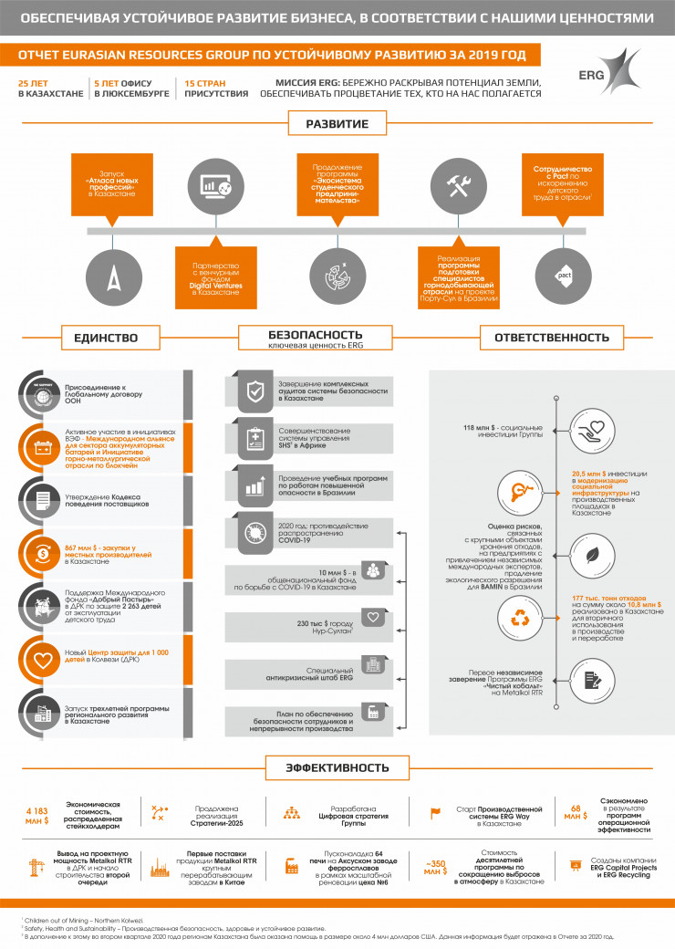 Сообщается, что в 2020 году в одном лишь Казахстане ERG выделила более 10 миллионов долларов на создание общенационального фонда, направленного на смягчение социально-экономических последствий пандемии, а также 230 тысяч долларов США городу Нур-Султану (в дополнение к этому во втором квартале 2020 года регионам Казахстана была оказана помощь в размере около 4 миллионов долларов США).