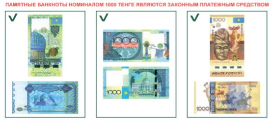 Отмечается, что памятные банкноты 1000 тенге, посвященные председательству Республики Казахстан в Организации Исламская конференция, и 1000 тенге, посвященные председательству Казахстана в Организации по безопасности и сотрудничеству в Европе, также являются законным платежным средством. Срок обращения по ним не устанавливается. Из оборота данные банкноты изымаются по мере естественного износа.