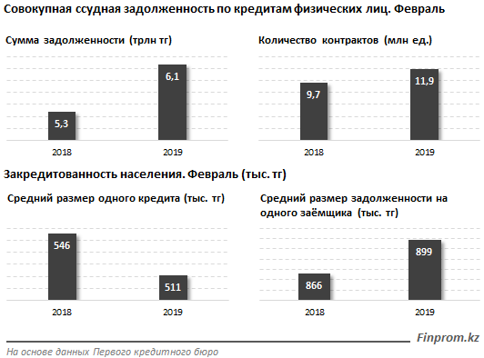 Совокупная ссудная задолженность по кредитам физических лиц перед всеми финансовыми институтами (БВУ, МФО, PDL* и прочими) на конец февраля 2019 года составила 6,1 триллиона тенге - на 15,1 процента больше, чем годом ранее. Количество контрактов по розничным кредитам выросло на 23,1 процента, до 11,9 миллиона.