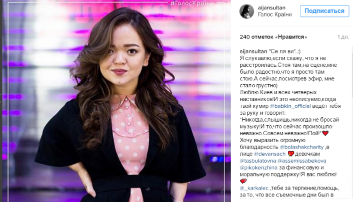 "Хотелось поделиться музыкой, которая звучит от моего сердца. Большая честь петь перед вами. В моем плей-листе 70 процентов песен украинских исполнителей. Здесь сидят все те люди, которым мне хотелось сказать спасибо", - обратилась после своего выступления Айжан к наставникам проекта, объяснив свое желание участвовать в украинском "Голосе". Ни один из судей не повернулся к девушке во время ее исполнения.