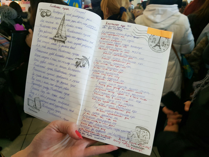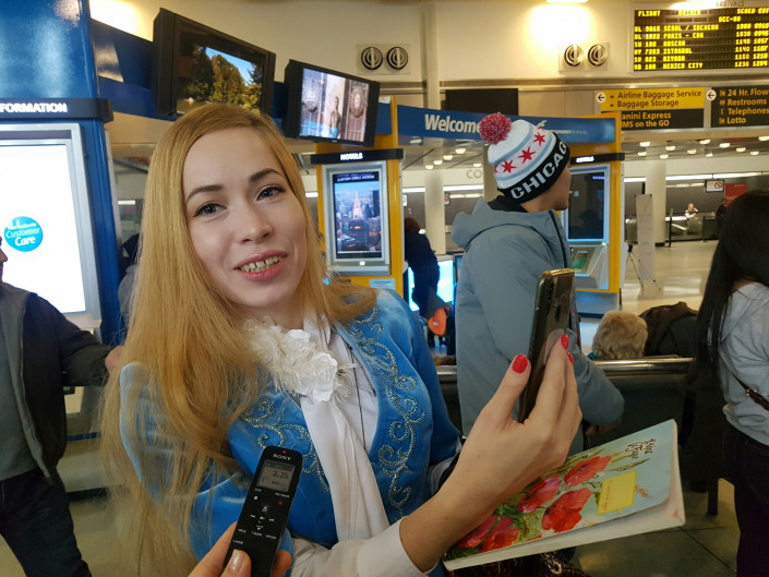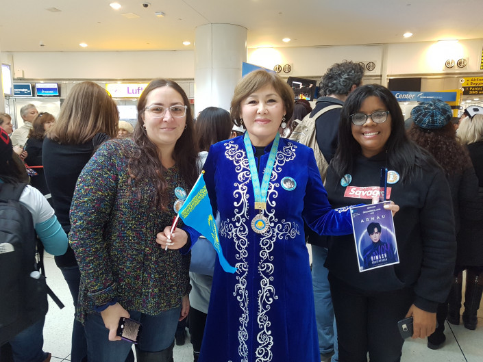 Вслед за Димашем из Санкт-Петербурга в Нью-Йорк прилетела его фанатка Екатерина. Решив порадовать артиста, она надела камзол с казахскими орнаментами и показала тетрадь, куда записывает его песни.