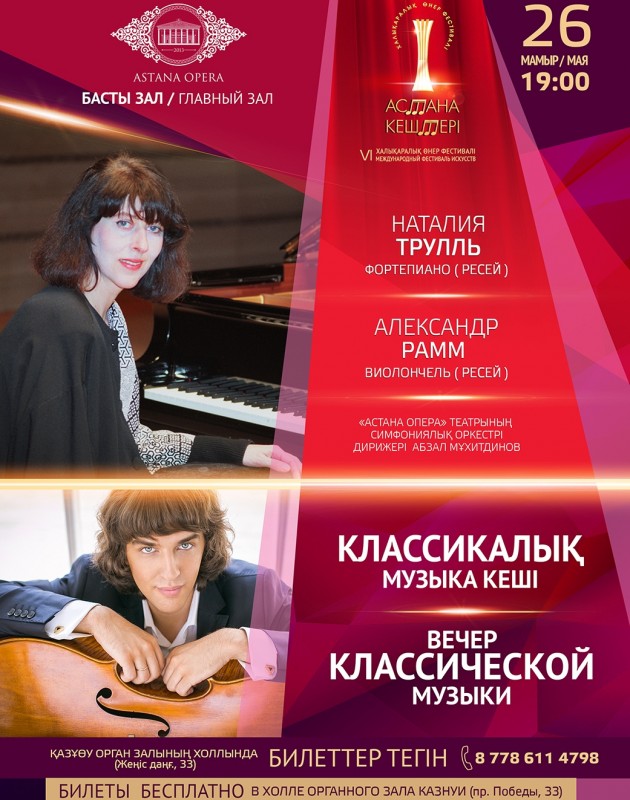 В фестивале принимают участие исполнители классической, народной, эстрадной музыки из разных стран мира. Так, 26 мая на вечере классической музыки в "Астана Опера" выступят один из самых ярких виолончелистов молодого поколения россиянин Александр Рамм и заслуженная артистка России Наталия Трулль на фортепиано, а также симфонический оркестр театра, дирижером которого является заслуженный деятель Казахстана Абзал Мухитдинов.