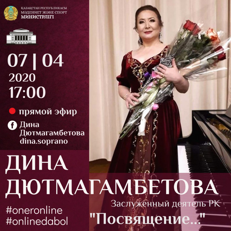 Сегодня, 7 апреля, свой домашний онлайн-концерт "Посвящение…" представит ведущая солистка театра, заслуженный деятель РК Дина Дютмагамбетова, сопрано. В программе прозвучат романсы и известные сочинения итальянских, русских и казахских композиторов. Благодаря своему природному таланту Дина Дютмагамбетова принимала участие в ярких проектах города и республики. Лауреат международных конкурсов, она интересовалась творчеством великих музыкантов и певцов, к уровню которых всегда стремилась. Время концерта становится традиционным - в 17.00 на странице в Facebook - Дина Дютмагамбетова.