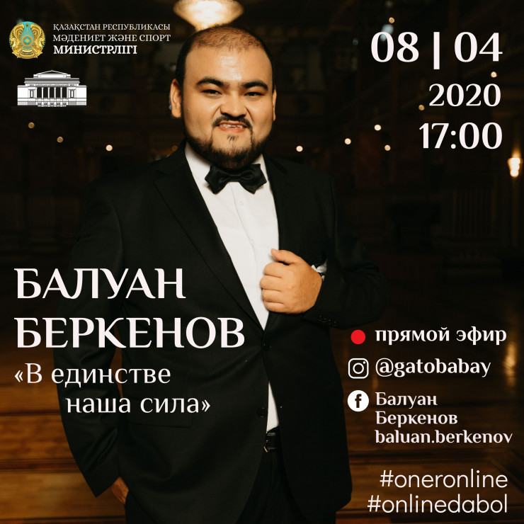 Следующим вечером, 8 апреля, в 17.00 свою концертную программу "В единстве наша сила", посвященную 25-летию Ассамблеи народа Казахстана, представит ведущий солист театра Балуан Беркенов, тенор. Лауреат международных конкурсов, он выступает на крупнейших концертных площадках Республики Казахстан. В эфире Home Online Concerts будут представлены произведения на семи языках, включающие в себя разноплановый репертуар, который Балуан давно готовил и хотел представить зрителю. Facebook - Baluan Berkenov с прямым перепостом на официальные страницы Facebook и Instagram Казахского государственного академического театра оперы и балета имени Абая.