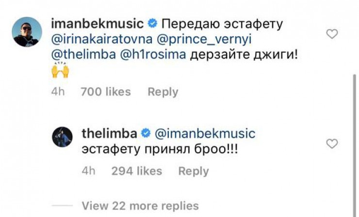 В комментариях под видео, где объявляют победителя в номинации за "Лучший ремикс", он написал, что передает эстафету соотечественникам "Ирине Кайратовне", The Limba, V $ X V PRiNCE и HIRO.