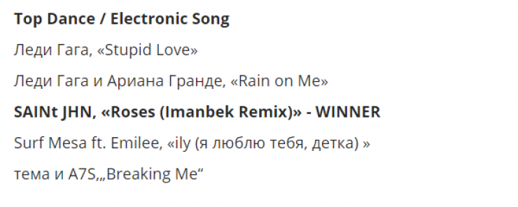 Отметим, что номинантами в категории "Лучшая танцевальная электронная песня" были Lady Gaga - Stupid Love, Lady Gaga, Ariana Grande - Rain On Me, Surf Mesa - ily (i love you baby), Topic, A7S - Breaking и ремикс Иманбека Roses.