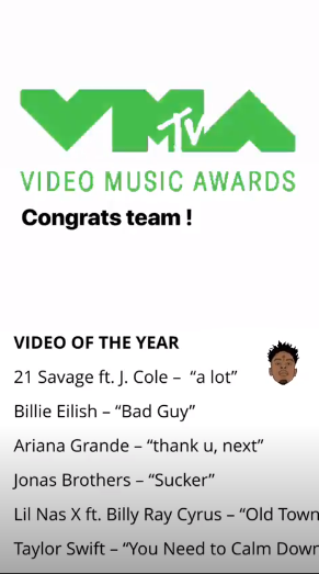 Клип на песню A Lot поборется за звание "Лучшее видео года". Конкуренцию ему составят Bad Guy Билли Айлиш, Thank u, next Арианы Гранде, Sucker Jonas Brothers, Old Town Road (Remix) Lil Nas X и Билли Рэя Сайруса и You Need to Calm Down Тейлор Свифт.