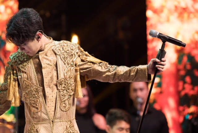 За весь концерт Димаш сменил несколько образов. Сначала он вышел в золотистом костюме, затем появился в костюме изумрудного цвета. А для номера с песнями Майкла Джексона он выбрал образ totаl blаck - черная куртка и черные брюки.