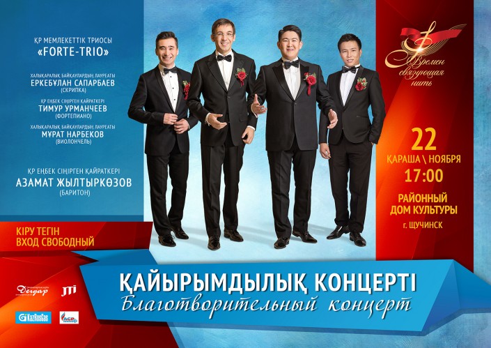 Концерт пройдет в областной филармонии имени Г. Курмангалиева в 18.30. 19 ноября благотворительный вечер для ветеранов состоится в Аксае (Западно-Казахстанская область) в районном Доме культуры, начало в 18.00. А 22 ноября концерт пройдет в Щучинске Акмолинской области в районном Доме культуры, начало в 17.00. Перед участниками ВОВ выступят известные казахстанские исполнители. Это коллектив FORTE -TRIO: кавалер ордена "Курмет" и заслуженный деятель РК Тимур Урманчеев, первая скрипка Государственного симфонического оркестра РК и Государственного камерного оркестра "Камерата Казахстана" Еркебулан Сапарбаев, а также виолончелист, лауреат международных конкурсов Мурат Нарбеков. Кроме того, выступит заслуженный деятель РК, оперный певец Азамат Жылтыркозов.